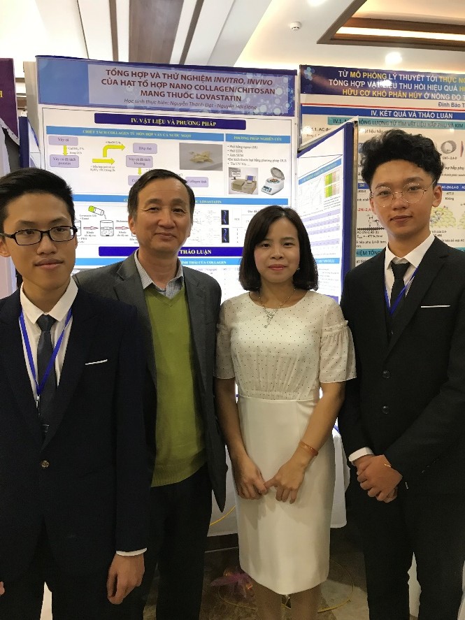 GS. TS. Thái Hoàng (thứ hai từ trái sang) và 2 học sinh cùng giáo viên phụ trách của Trường THPT chuyên Nguyễn Huệ tại cuộc thi Khoa học, kỹ thuật học sinh trung học cấp quốc gia năm 2017